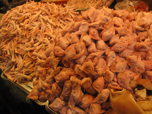 Pyramids of naked chicken heads, piles of pig snouts, messes of fish, weird bakes goods, colorful coconut deserts, ancient looking candies, bite sized dried fish, rice everything, assorted sausages, and all kinds of tropical fruit and vegetables are to enjoy in a local Manila market.