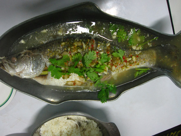 The main event was a fashionable steamed Snapper swimming in boiling lemon and chili sauce (plah ka pung neung manow), with a few stunner companions consisting of Thai egg curry with squid (pad pongali plahmuk), oyster omellette on a hot plate (plasawan), stir fried morning glory (pad pak bung), and of course large bowls of steamed rice.