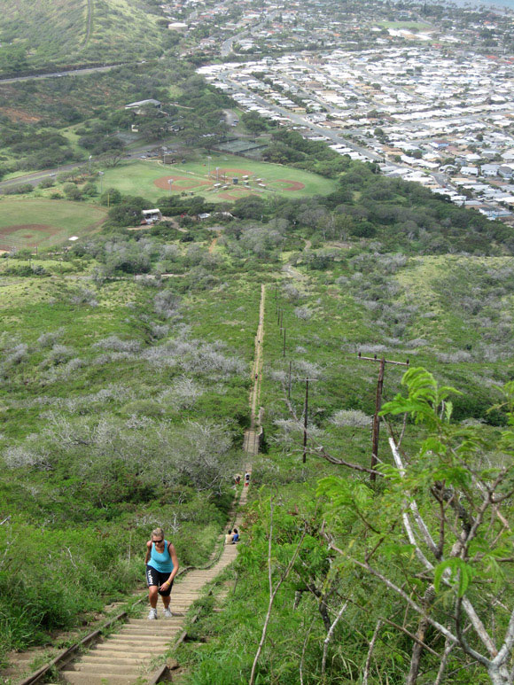 The path begins with a gradual incline before getting steeper and steeper with every railroad step. With each step comes a gain of elevation and the view of the ocean and city of Honolulu becomes more and more scenic.