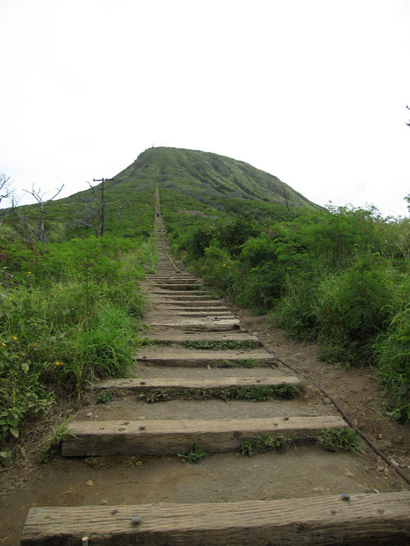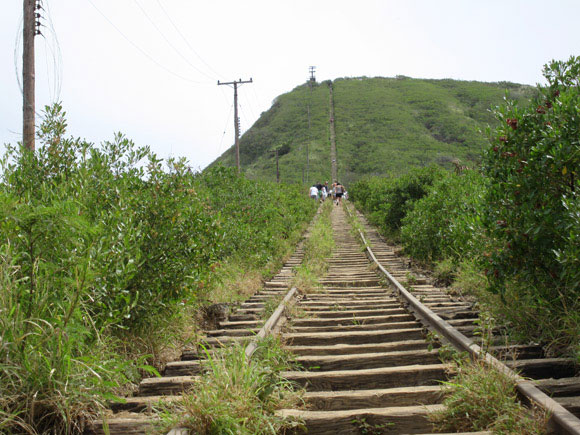 An abandoned railway tram track formerly used to transport goods to the military bunkers on top now acts as a convenient path straight up the side of Koko Head crater.