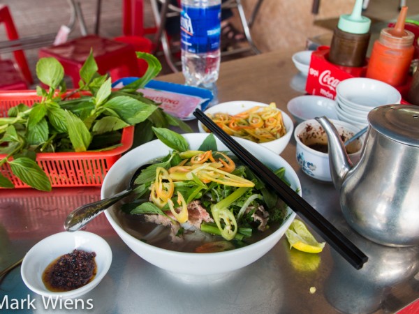 I had a plate of noodles fried with beef (mì gói xào bò), and sitting on a stool in the morning while eating and drinking coffee, I was extremely happy.