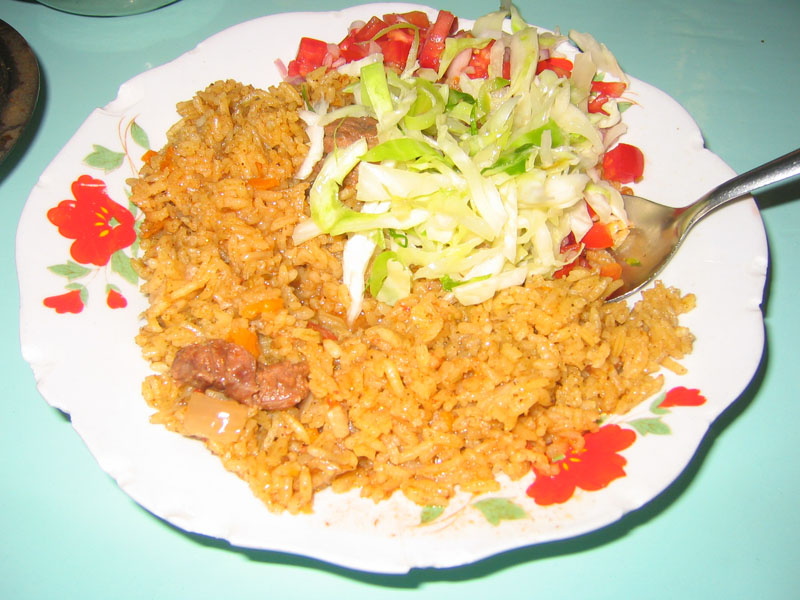 Jollof rice is an essential and delicious part of the West African diet and is fundemental in Ghana. Rice is mixed with meat or chicken, tomato sauce, chili pepper, some onions, ginger, nutmeg among other spices, and then cooked up altogether in a single pot. The result is an ultra fragrant all-in-one meal of a dish. A few fried plantain bananas go well with the Jollof rice for super satisfaction.